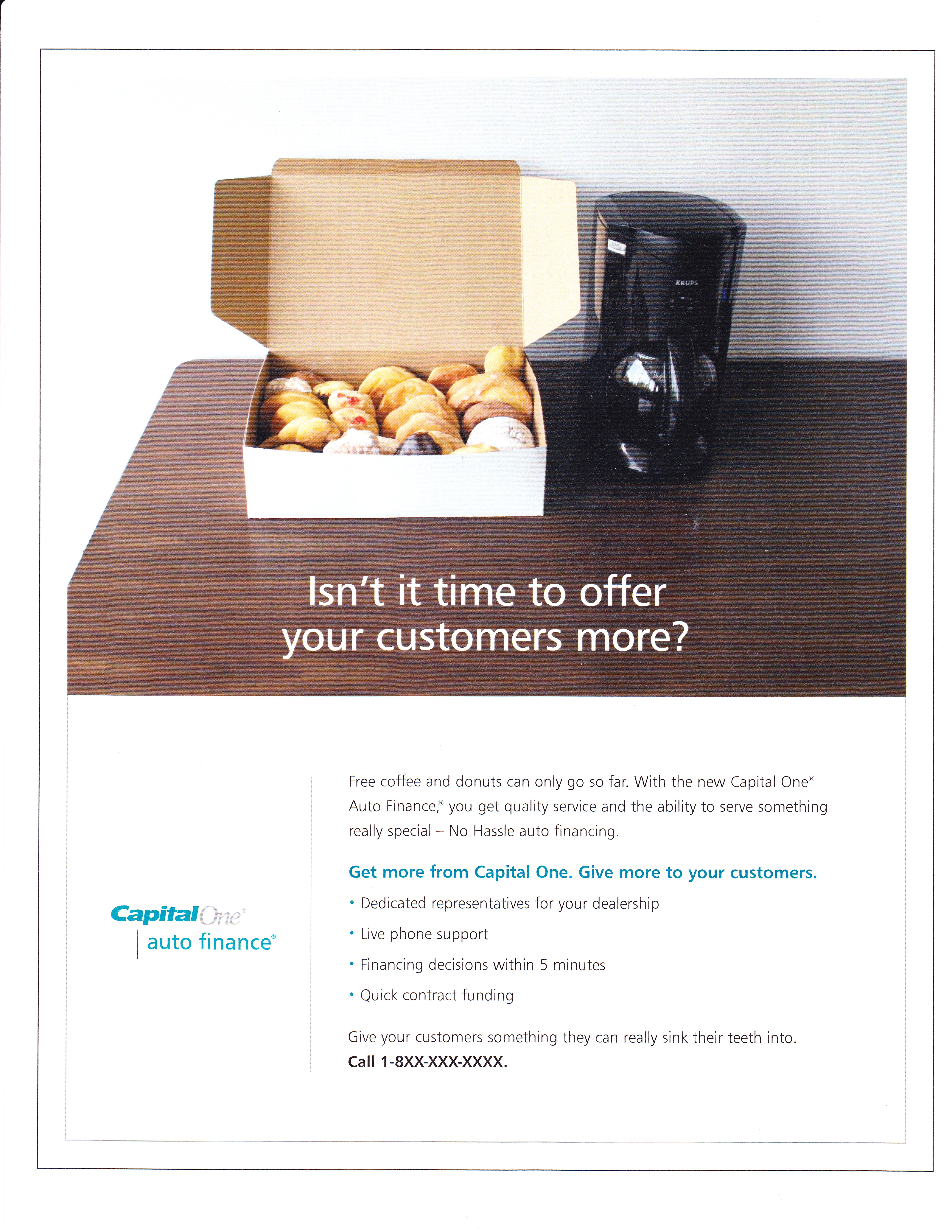 Description: Capital One’s auto loan department wanted to grab some of the market share from their competitors. So we created a series of ads – which ran in trade publications – that spoke directly to finance specialists at car dealerships. Since the majority of the competition focused their messaging on low rates, I decided to focus these ads on Capital One’s outstanding service. The result was a distinctive ad that set Capital One apart from the others in the publication.