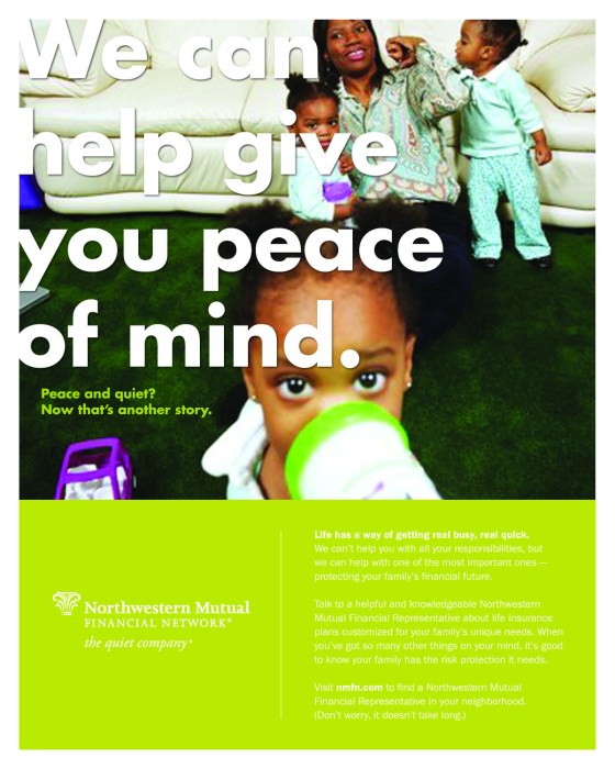 Description: Northwestern Mutual was looking for new approaches to reach new and existing clients. The art director and I paired a light and comical tone with lifestyle photography. This allowed us to showcase Northwestern Mutual as an understanding and warm institute while stressing the importance of their services. Though part of a larger presentation, this creative helped to land Northwestern Mutual as a client for Merkle.